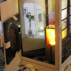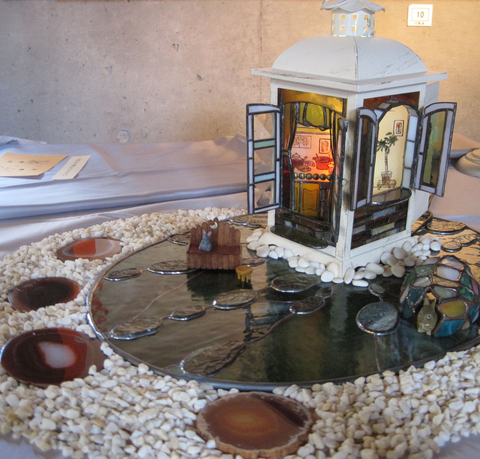 前回のブログ 「家型のランプ 制作は絨毯から」 は、絨毯の柄をサンドブラストで彫ったという内容でしたが、色々な技法を駆使して、楽しさと見どころが満載の家ができました。第32回 びどりを作品展 出品作です。