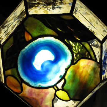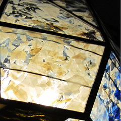 随分前になりますが、ネパールの4000m位の位置にあるエベレストの見えるホテルに泊まった時のヒマラヤの山々の強烈な印象をランプにして見ました。ちょうどウロボロス社の最新のガラスがぴったりイメージにあって良かったです。彩色水晶を二枚持っていて、対にヒマラヤの氷河湖のランプも作りました。