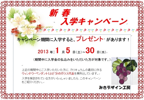 当工房では、『新春 ご入学キャンペーン』 として、上記の期間中にご入学いただいた方に、普通科のカリキュラムの最初に作るウィンドゥ・ペンダント(ぶどう)のガラス代金を無料といたします。