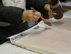 平らな棚板などの場合は、この写真のように、はけで離型剤を薄く塗り重ねます。