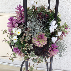 廊下で、知り合いのハンギング作家さんにプレゼントしていただいた、春らしい草花が皆さんをお出迎えしています。