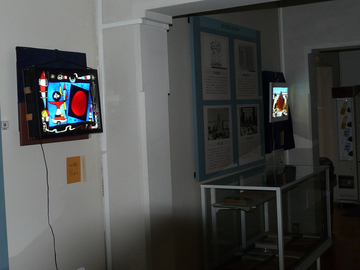 真っ赤な鏡に立ち向かう女。ミロの原画と色彩の魅力をステンドグラスにしてみたいと思い制作した。黒被せガラスをサンドブラストする予定であったが、被せが厚くて断念し、黒グリザイユを削って描いた。