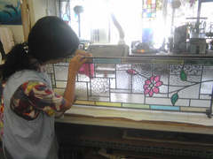 前回のブログは、アネモネの花をモチーフにしたランプ。今日は、クレマチスをモチーフにしたパネル(第32回 びどりを作品展 出品作) をご紹介します。