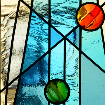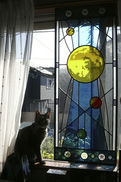 自室の窓が向かいのお宅から丸見えなので、目隠し用に作りました。室内が暗くならず、外から見えず、通った光が邪魔にならないようにガラスの色と質感を選んで組み合わせてあります。実用品なのでデザインと色使いは抑えめですが、サンドブラストした月と、発色のよいガラスによる惑星を配し、アクセントにしました。