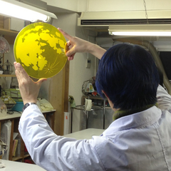 ← サンドブラストした月を掲げる酒井さん