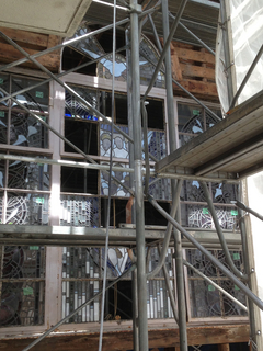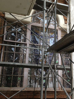通常は、一つの窓ごとに順次修復していくのですが、今回は、とにかく量が多いし、工期がないので一度には直せません。とりあえず三連の左右は、取り外して一時保管し、後日、窓に戻す予定になりました。