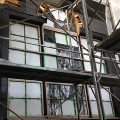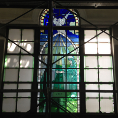 ステンドグラスの修理完成まで、場所によっては2ヵ月近く養生のままでしたので、ゲリラ豪雨の後、台風の前後には気を遣いました。