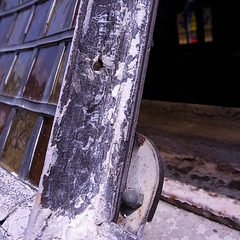 ←の写真は、スティールサッシから白パテを斫り、ステンドグラスを取り外したところですが、小さな穴が一ヵ所あるのがわかりますか?