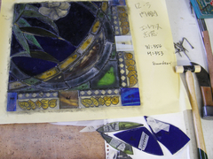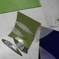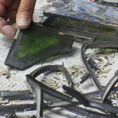 オリジナルと同じ太さの新しい鉛線で、ガラスを組み上げ、半田付けをします。
