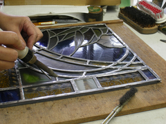 ガラスと鉛線の間にパテを詰めて、馬ブラシで磨き、出来上がり。