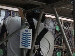 他の職人さんたちも、休憩が終わり足場に上がっていく前に、シューッと防虫スプレーを一吹きしています。