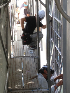 足場をのぼって見に行ったら、なんと! トタン屋根の上でガラスを切っている!