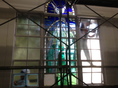 これで、450箇所のうち、三連の窓の中央の部分、222箇所の分のステンドグラスと当てガラスが入りました。