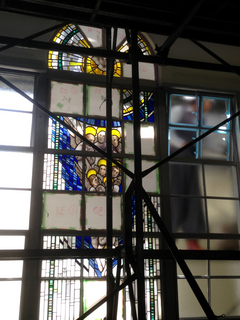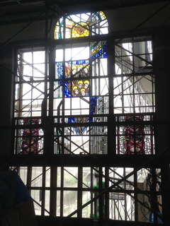 これを一度には直せないので、とりあえず一部 (三連の窓の左右の部分) は取り外すことになりました。一番、傷みが激しく、ガラスが飛び出したりしている部分だったからです。