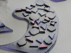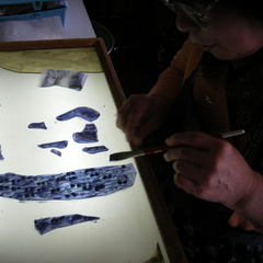 フュージングが終わったガラスに、グリザイユで線描きしたり、エマイユ彩色したり…