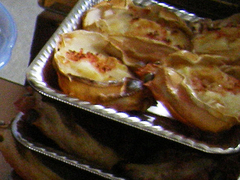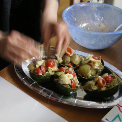 左の写真は、お料理上手のシマちゃんが、アボガドにチーズとトマトと… を詰めています。