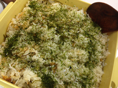 じゃことこんぶと・・・・ の炊き込みご飯。カニの甲羅焼きグラタン。