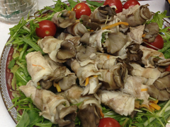 嶋本先生の野菜ときのこの肉巻き。 esseさんのゴマ練パンとレバーペースト。