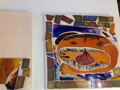 サンドブラストし、絵付けして窯に入れて焼きます。