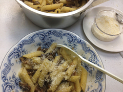 そして、今日、2013年12月28日(土)の打上げは、フンギ( しいたけやポルチーニなどのキノコ類) のペンネに、パルミジャーノ・レッジャーノをすりおろしてかけ、いただきました。
