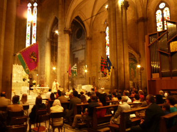 下の写真は、左側に後陣の3連のステンドグラスの右端が写っています。祭壇に向かって、ちょっと右を向いたアングルです。