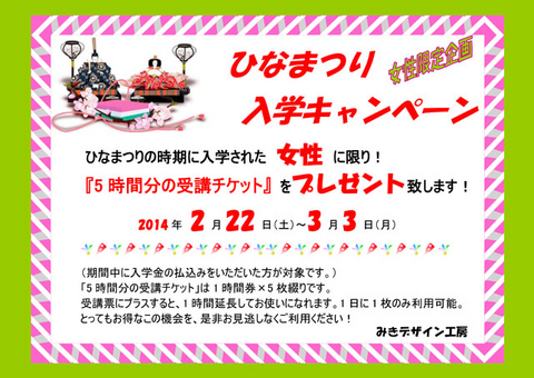 「ひなまつり 入学キャンペーン」 は、ひなまつりの時期に入学された女性 に限り! 『5時間分の受講チケット』 をプレゼント、というキャンペーンです。