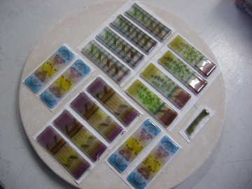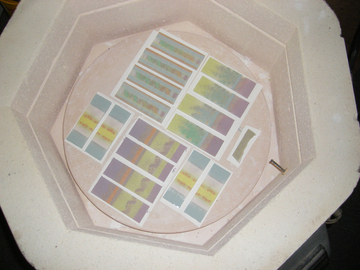 下の写真は、ブルズアイの90の板ガラスに、90のガラスパウダーをのせたものを、窯に入れたところです。