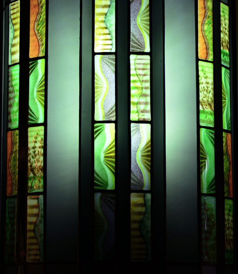 緑がかったグレーのアンティークガラスは、ランバーツ社(ドイツ)へ行った時に、数多くのグレーの中から選んできたものです。