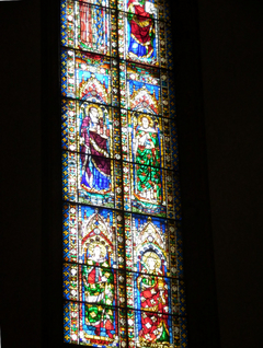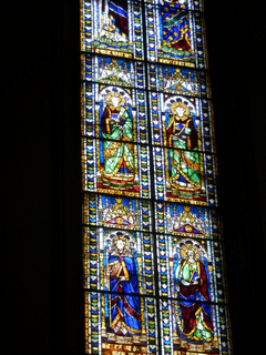 このステンドグラスは、構図や、人物の表現方法からして、ルネサンス美術の影響を強く受ける前のステンドグラスじゃないかな?