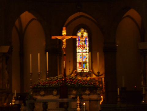 クーポラの下を通り過ぎ、祭壇の向こう側、後陣のステンドグラスです。