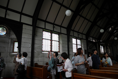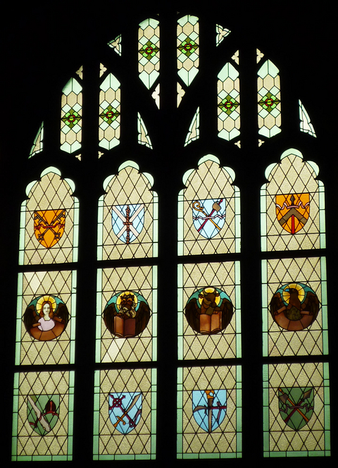 入口を入って左側、皆で記念撮影した写真の左上に映っているステンドグラスです。