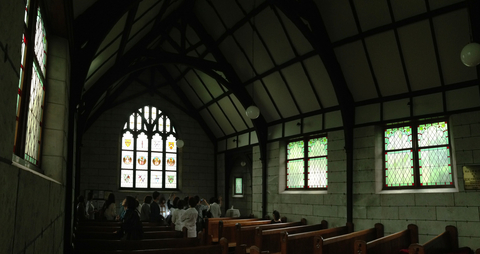 シンプルなデザインのステンドグラスと、内壁の自然な色とで、とても落ち着く礼拝堂です。