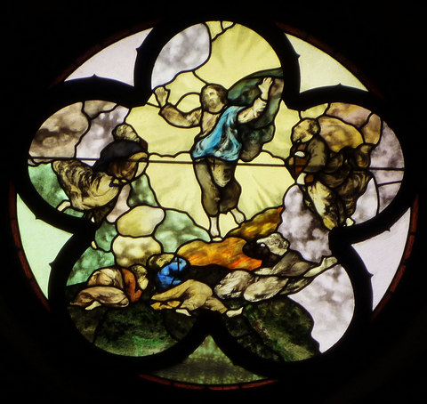「東壁面上部のキリストの変容を描いた桜花形のステンドグラス」