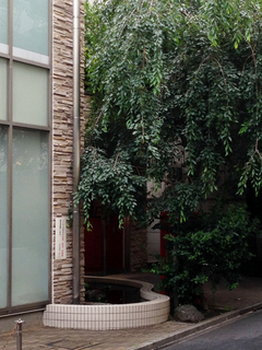 工房の前のビルのエントランスにしだれ桜の木があり、その下に小さな池があります。