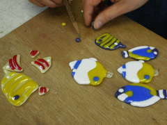 上の写真: ガラスフュージングでお魚さんをたくさん作りました