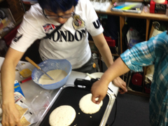 今回のパーティーは、特に 「いま、ブームのパンケーキも焼きます!」