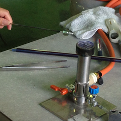 好きな色のガラス棒を3色選び、クルクルクルクル、バーナーの上で回しながら作るトンボ玉。