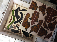そうして、出来た原画に合わせて、ガラスの色を選び、ガラスを切り分け、下の左側の写真のように、筆で描いていきます。