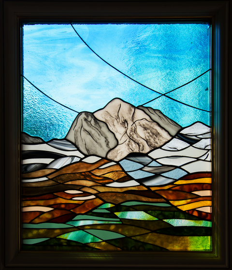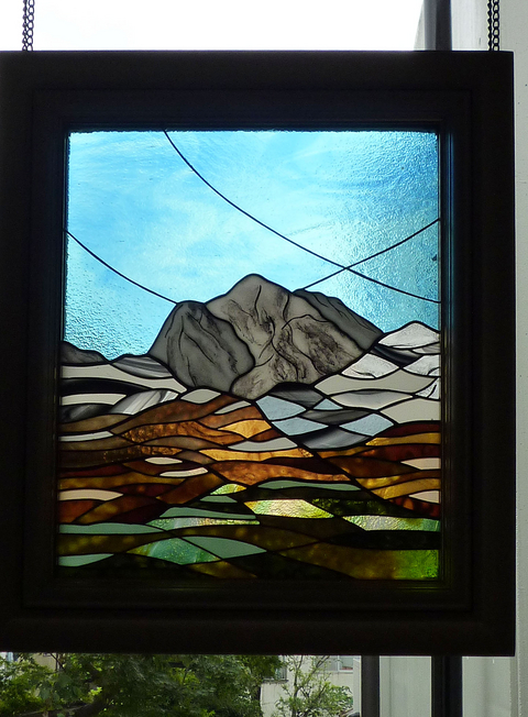 前面の山々は、グレー 〜 茶 〜 グリーン系の色ガラスを配置して