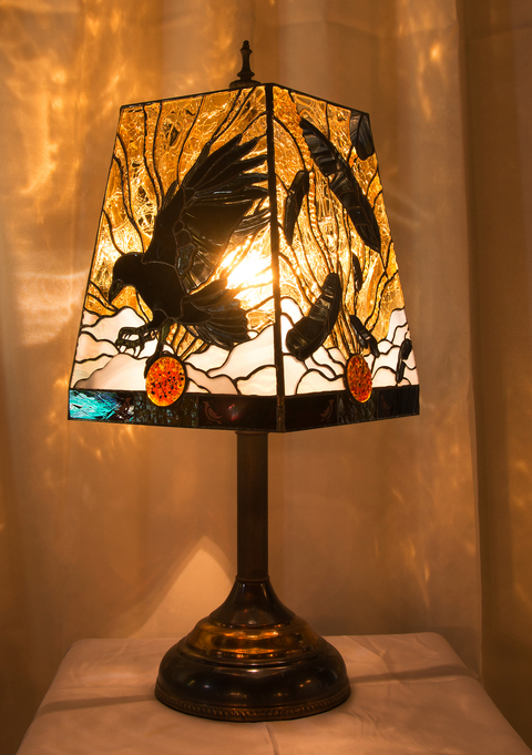 いつも青いガラスばかり使い、冬場は自室があまりに寒々しくなるので、普段使わない温かい色のランプを制作しました。