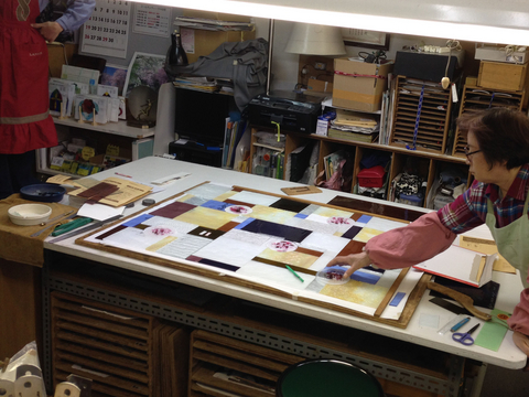TVドラマ、浅見家の窓に入っているステンドグラスがいいな!ということで作ってしまいました。いつもそばにあるので、優しい色のガラスやロンデールを使うと決めました。高橋先生が岩手まで設営に行って下さり、翌日から親戚や友人が入れ替わり立ち替わり。この部屋がいいと言って下さり、来年3月にはここで誕生会をしようということになってしまいました。この部屋には、スズカケのパネルのほかに昨年出品の「松山の虎舞」、30回展「ランのランプ」、12回展?「牡丹の衝立」が置いてあり、好きな作品に囲まれています。