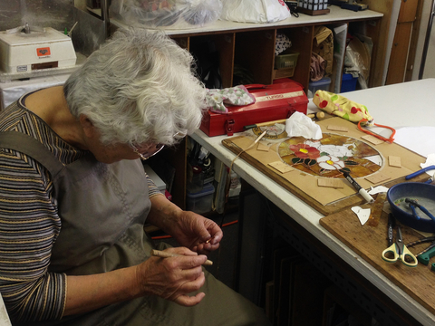 おだやかな口調で楽しいお話しをしながら、ステンドグラスを作っていますが、
