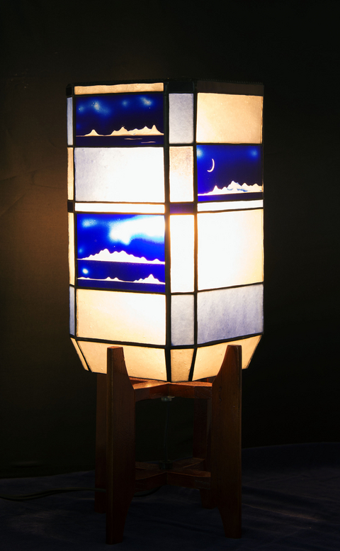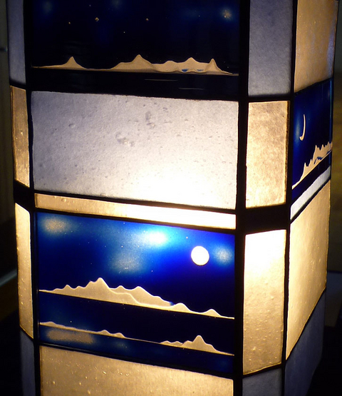 パネル 「山と空と森の響き」 で使ったサンドブラストによる山と空の陰模様を