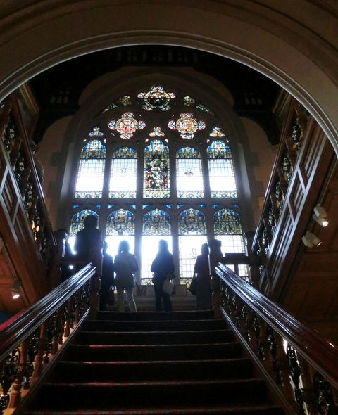 2階から見た大きなシャンデリアと、ステンドグラスの大窓。