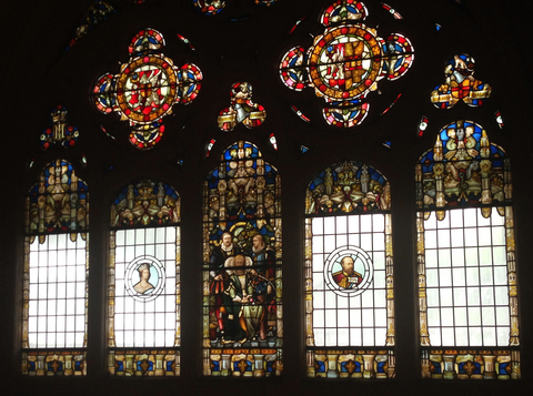 その下の暖色系のステンドグラスは、おそらく中世のステンドグラス。