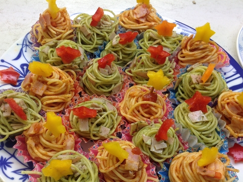 これは緑色のバジルパスタと赤いトマトソースパスタで作ったXmasツリー。