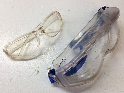カンタベリー大聖堂付属ステンドグラス工房に工房見学に行った際、中世の工具を借りてガラスカットをした時も、ゴーグルなしでやろうとしたら、あわててゴーグルを差し出されました。