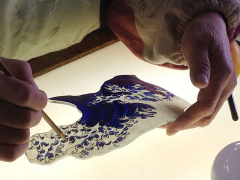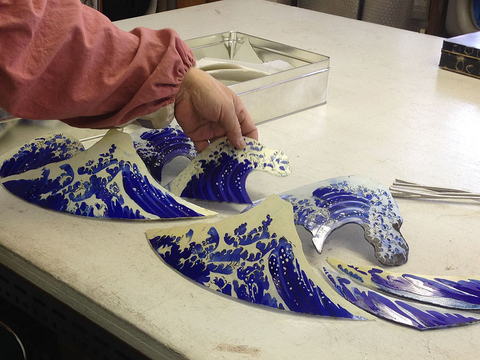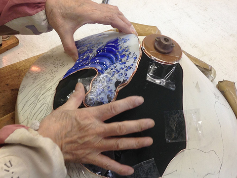スランピングしたガラスピースを、モールドにあてて微調整。