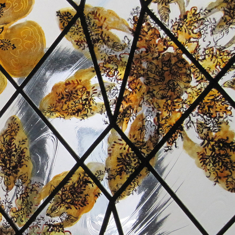 このパネルには、黄色と濃いめのアンバーと2種のシルバーステインを使い、