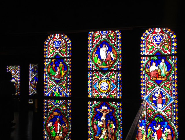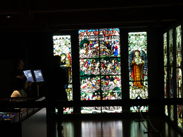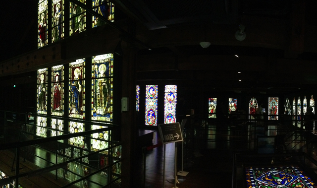 私の想像ですが、1階にも2階にも、セットで展示されている大きなステンドグラスは、
